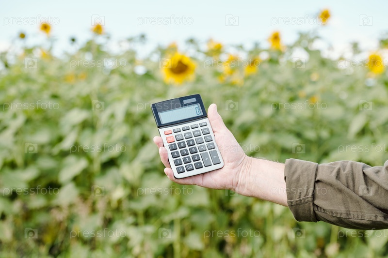 Руки старшего фермера-мужчины в рабочей одежде, держащего калькулятор с нулем на дисплее