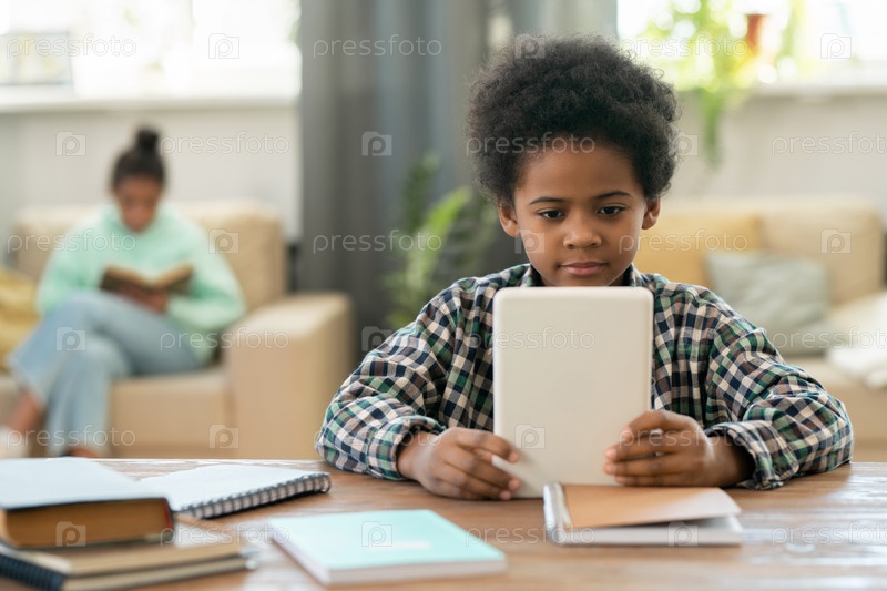 Милый начальный школьник африканской этнической принадлежности смотрит онлайн-уроки дома