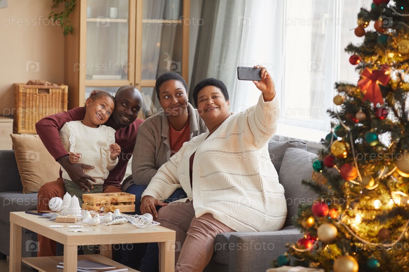Афроамериканская семья делает селфи на Рождество