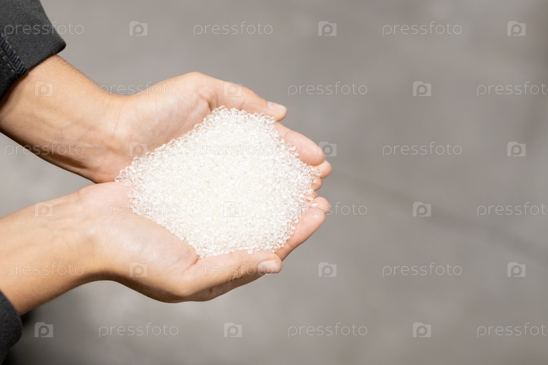 Руки молодой женщины-работницы, держащей кучу необработанных белых пластиковых гранул