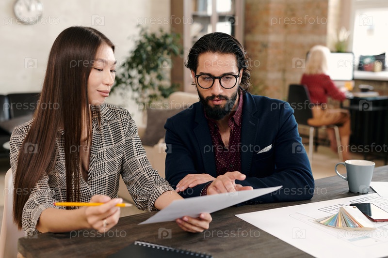 Офисная работница смотрит на эскиз на бумаге, а ее коллега указывает на него