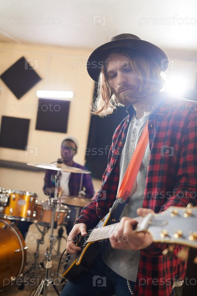 Молодой человек играет на гитаре на репетиции