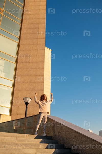 Счастливая молодая спортсменка-победительница с поднятыми руками, стоящая на мраморной лестнице