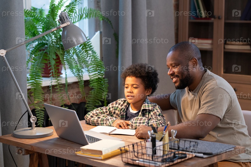 Африканский школьник и его отец смотрят на дисплей ноутбука во время онлайн-урока
