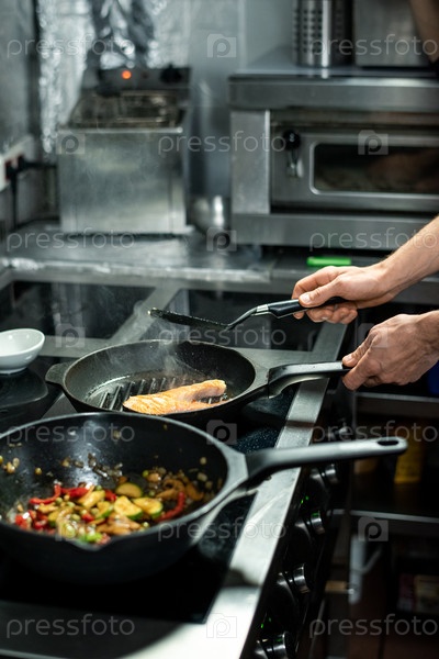 Руки мужского шеф-повара жарят кусок лосося во время приготовления рыбы и овощей