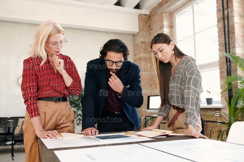 Пенсивные межкультурные разработчики мобильных приложений смотрят на планшетный дисплей