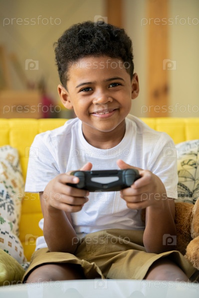 Веселый мальчик африканской этнической принадлежности с джойстиком смотрит на тебя с улыбкой
