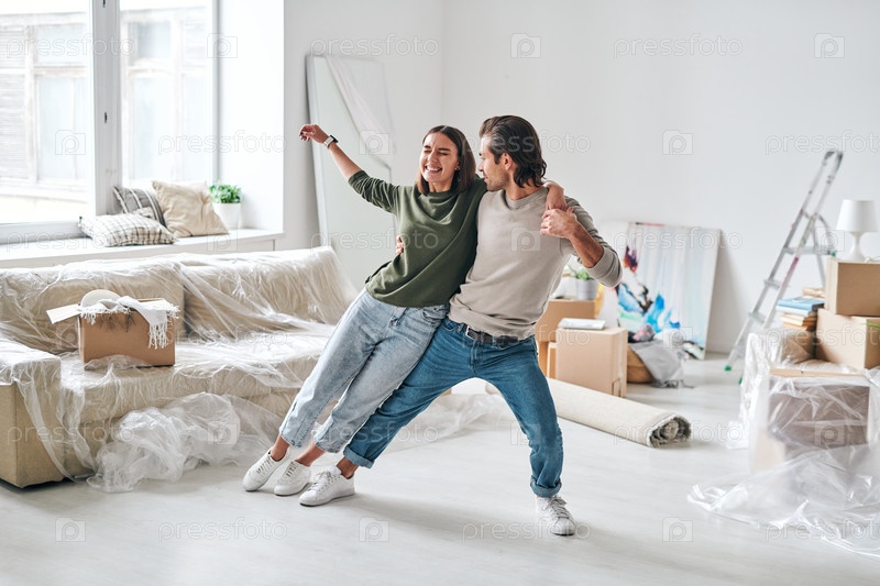 Молодая смеющаяся женщина в повседневной одежде, опираясь на мужа, пока оба танцуют