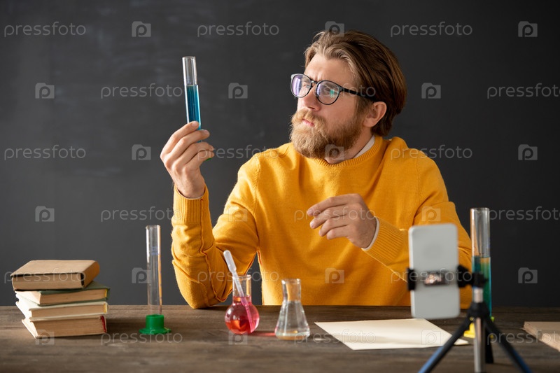 Молодой бородатый учитель химии смотрит на трубку с розовой жидкой субстанцией