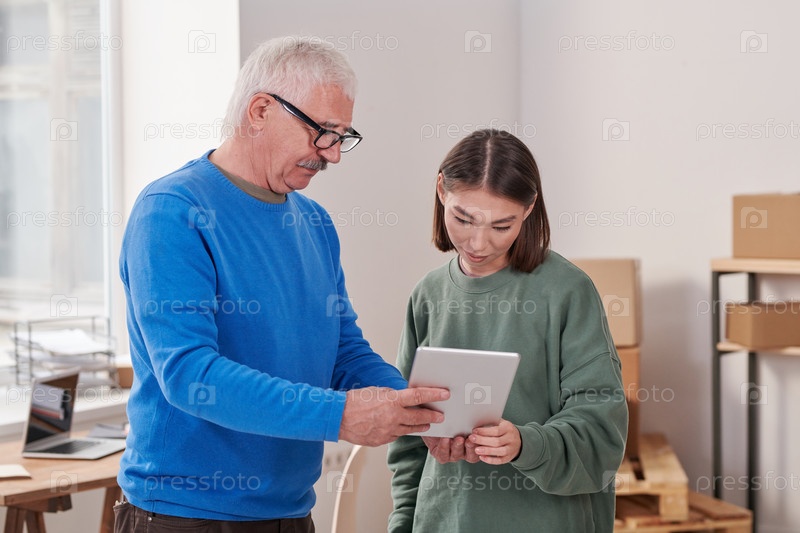 Контент старший мужчина с усами, использующий планшет во время анализа информации о заказе со своим коллегой в хранилище