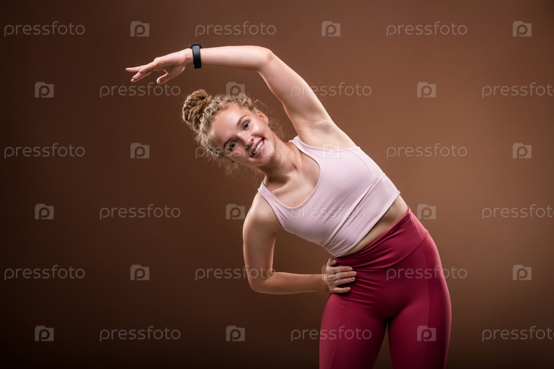 Веселая женщина в спортивной одежде стоит перед камерой и занимается боковыми прогулками