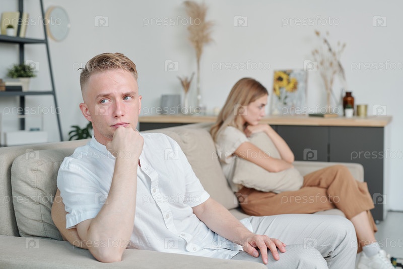 Молодой обиженный или раздраженный мужчина сидит на диване, игнорируя свою несчастную жену