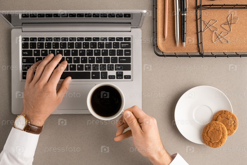 Вид на руки занятого молодого офисного менеджера или брокера с чашкой кофе