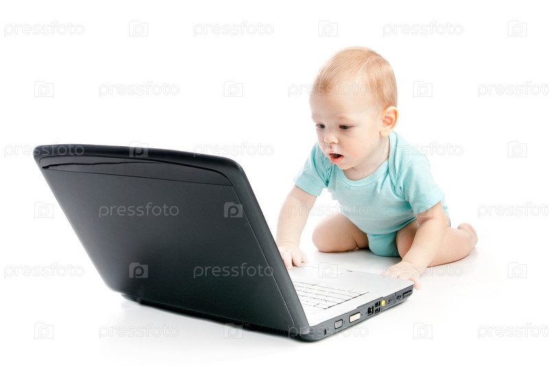 Ребенок использует ноутбук над белым