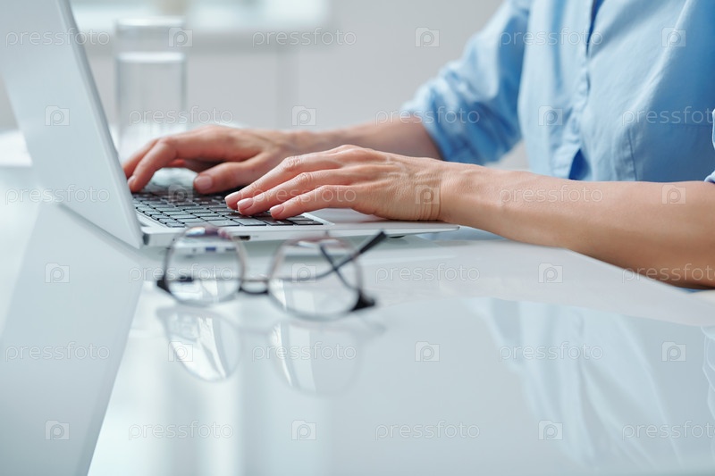 Руки молодой элегантной деловой женщины в голубой рубашке, сидящей перед ноутбуком