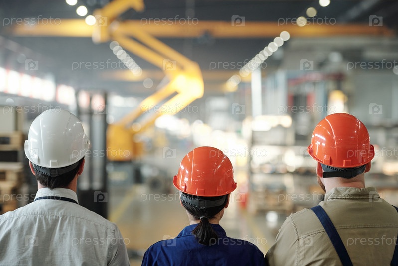 Задний вид команды современных инженеров в хардхетах