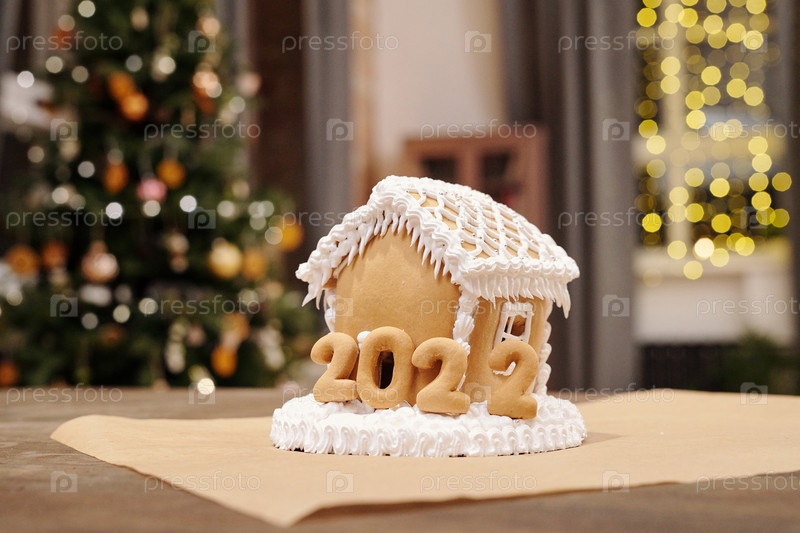 Домашний дом с пряничным печеньем, украшенный сливочной смесью и выпеченными номерами