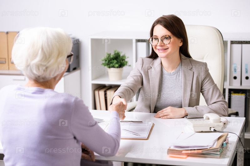 Молодой успешный агент смотрит на женщину-пенсионера, обнимая ее за руку