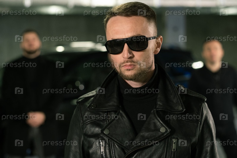 Уголовное управление в солнцезащитных очках и кожаной куртке стоит на парковке
