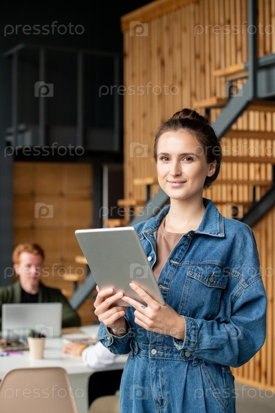 Молодая успешная бизнесвумен с темными волосами стоит перед камерой