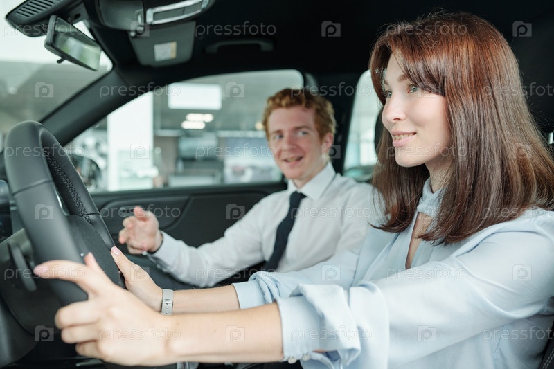 Счастливая молодая самка, сидящая в новой машине и держась за руль во время пробной езды