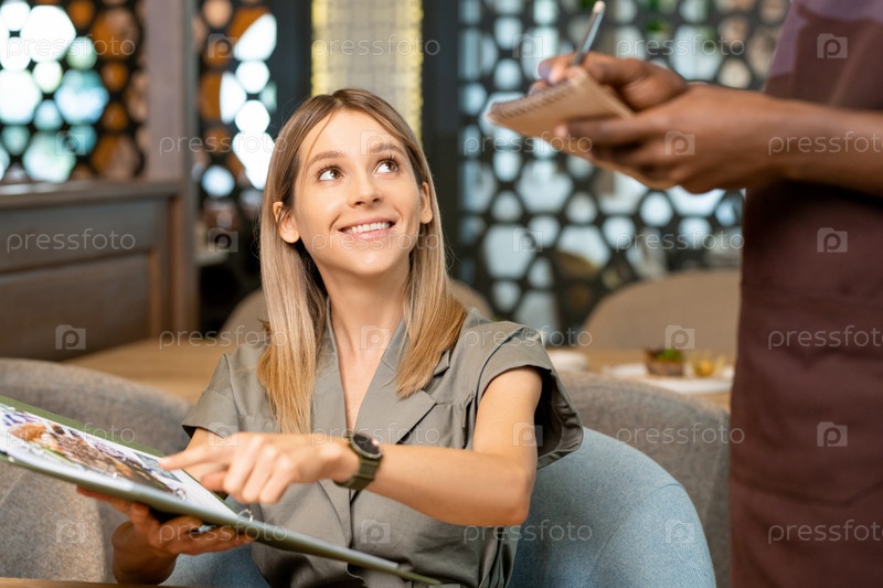 Руки африканского официанта, стоящего за столом и принимающего заказы от улыбающейся блондинки