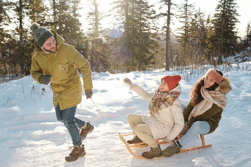 Две радостные девушки в зимней одежде сидят на санях, пока молодой человек их тянет