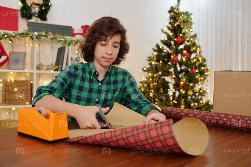 Мальчик режет упаковочную бумагу