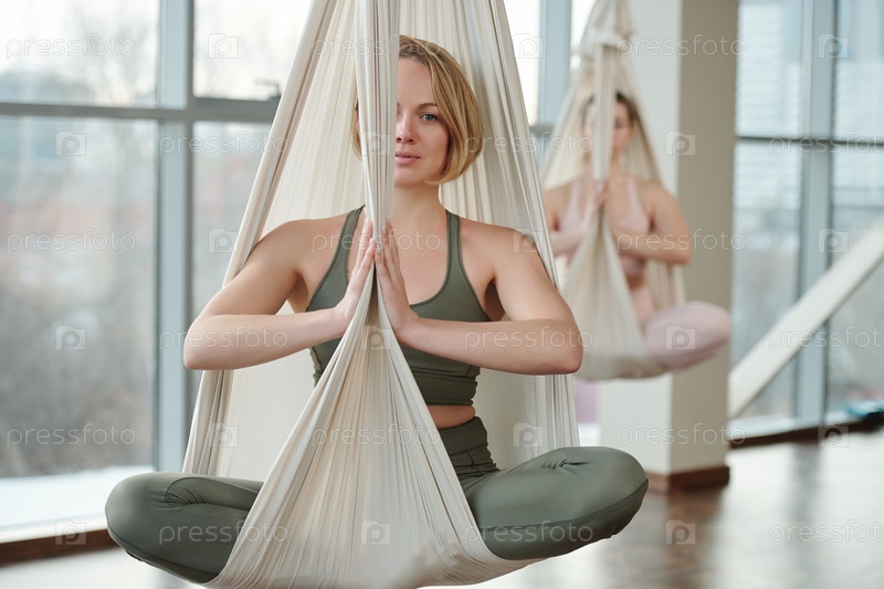 Молодая женщина в спортивном костюме сидит в позе лотоса на гамаке для йоги