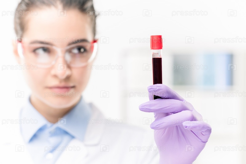 Перчатковая рука молодой женщины-клинициста или химика, держащей флакон