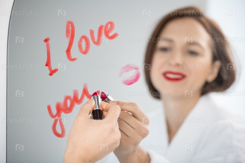 Отражение красивой молодой женщины, пишущей любовное послание с помощью печати губ на зеркале
