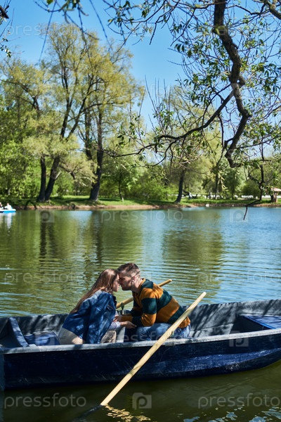 Любящая пара лодкой в парке