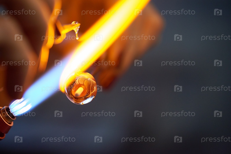 Современный ремесленник сжигает стеклянную заготовку, держа ее близко к огню