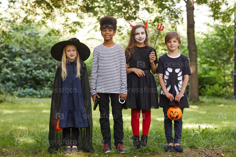 Дети, одетые в костюмы Хэллоуина на улице
