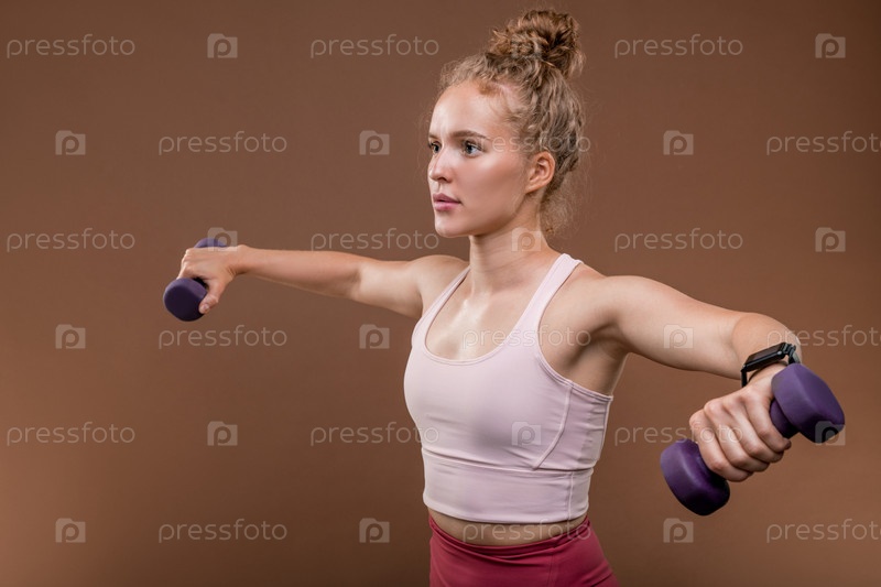 Красивая блондинка-спортсменка в спортивной одежде, занимающаяся с распростертыми руками