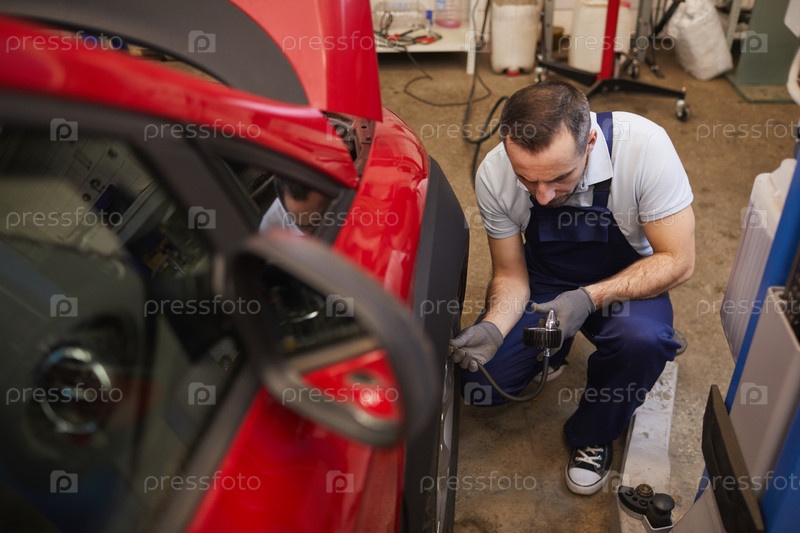 Автомеханик проверяет давление в шинах