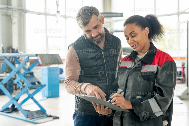 Молодая женщина-работница службы технического обслуживания автомобилей, указывающая на документ