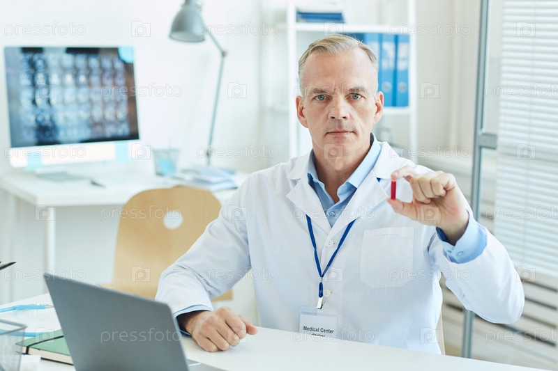 Красивый доктор позирует за столом в клинике