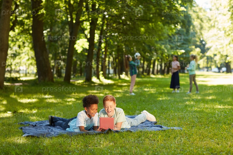 Мальчики, использующие цифровые планшеты в парке