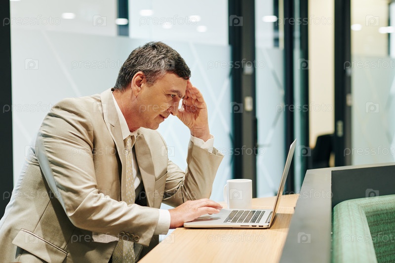 Усталый бизнесмен, работающий на ноутбуке