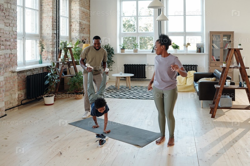 Молодой отец держит ноги игривого маленького сына, движущегося по рукам на полу