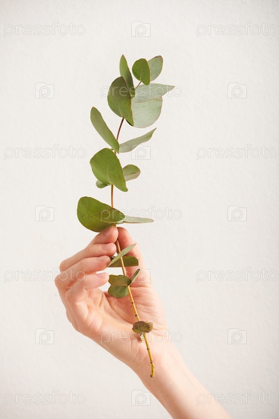Вертикальный крупный снимок неузнаваемых молодых женщин, держащих в руках ветку зеленого растения на белом фоне, копирование пространства