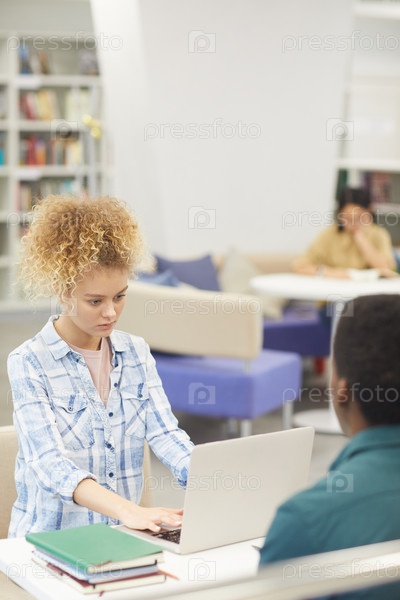 Молодая женщина учится в библиотеке