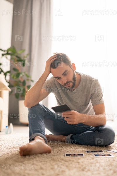 Одинокий мужчина смотрит фотографии