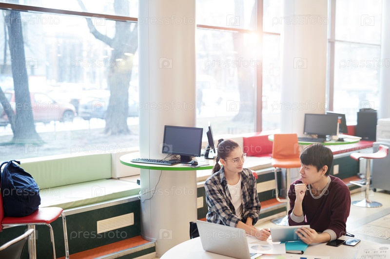 Студенты колледжа, использующие планшетный компьютер