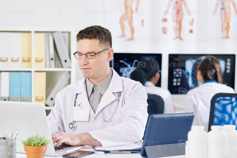 Врач общей практики работает на ноутбуке