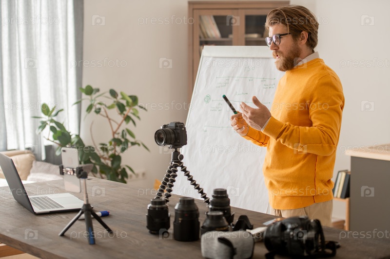 Молодой учитель профессиональной фотографии показывает новую модель фотоаппарата