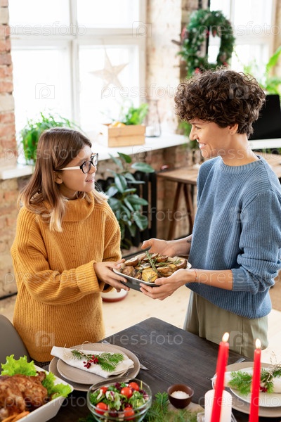 Счастливая молодая женщина передает своей дочери-подростку миску с жареным картофелем