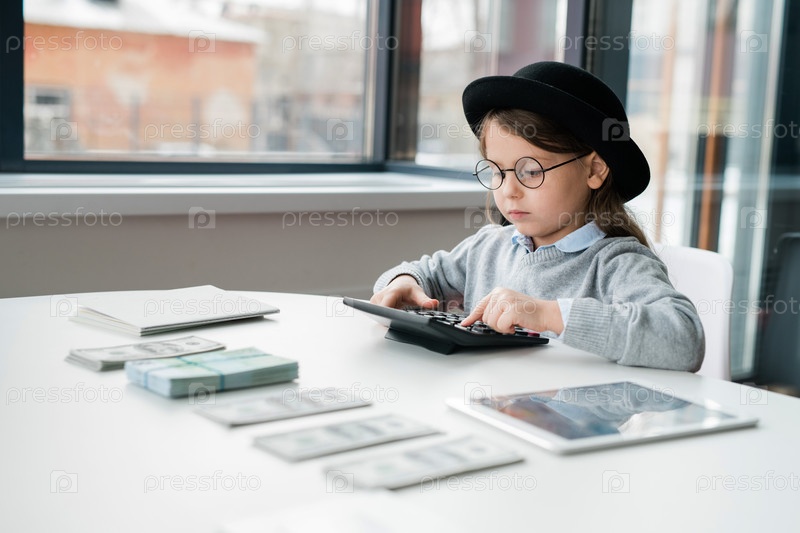Серьезный бухгалтер в шляпе и очках, использующий калькулятор при подсчете зарплаты