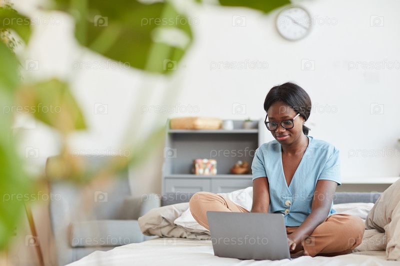 Афроамериканская женщина использует ноутбук в постели
